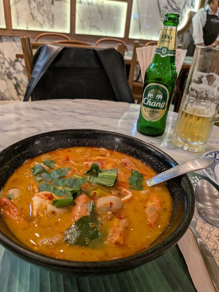 最後に結局またデパ地下になりましたが、トムヤムクン(280バーツ)とチャーンビール(90バーツ)で最後のタイメシとなりました。デパ地下はめっちゃ高いですね。。